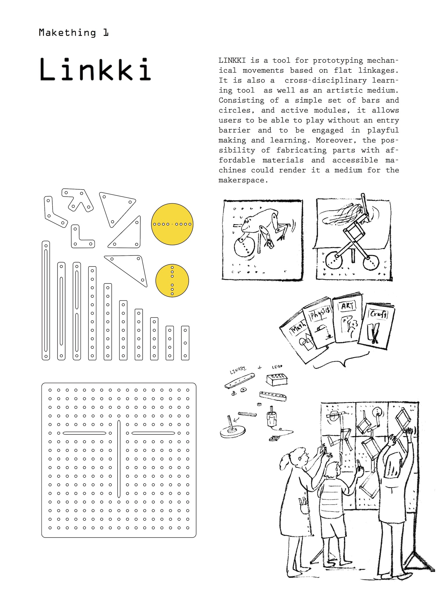 LINKKI is a kinetic construction toy based on flat linkage mechanism with which users can design movements, make kinetic arts and learn basic STEM subjects. Consisting of a modular box, bars and circles, and active modules, LINKKI simplifies the technical construction toy, still retaining the versatility of construction blocks as an educational tool and a designer’s prototyping tool. It was featured in Fast Company's Co.Design, designboom, and CreativeApplications.net and was awarded iF Student Design Awards 2016.